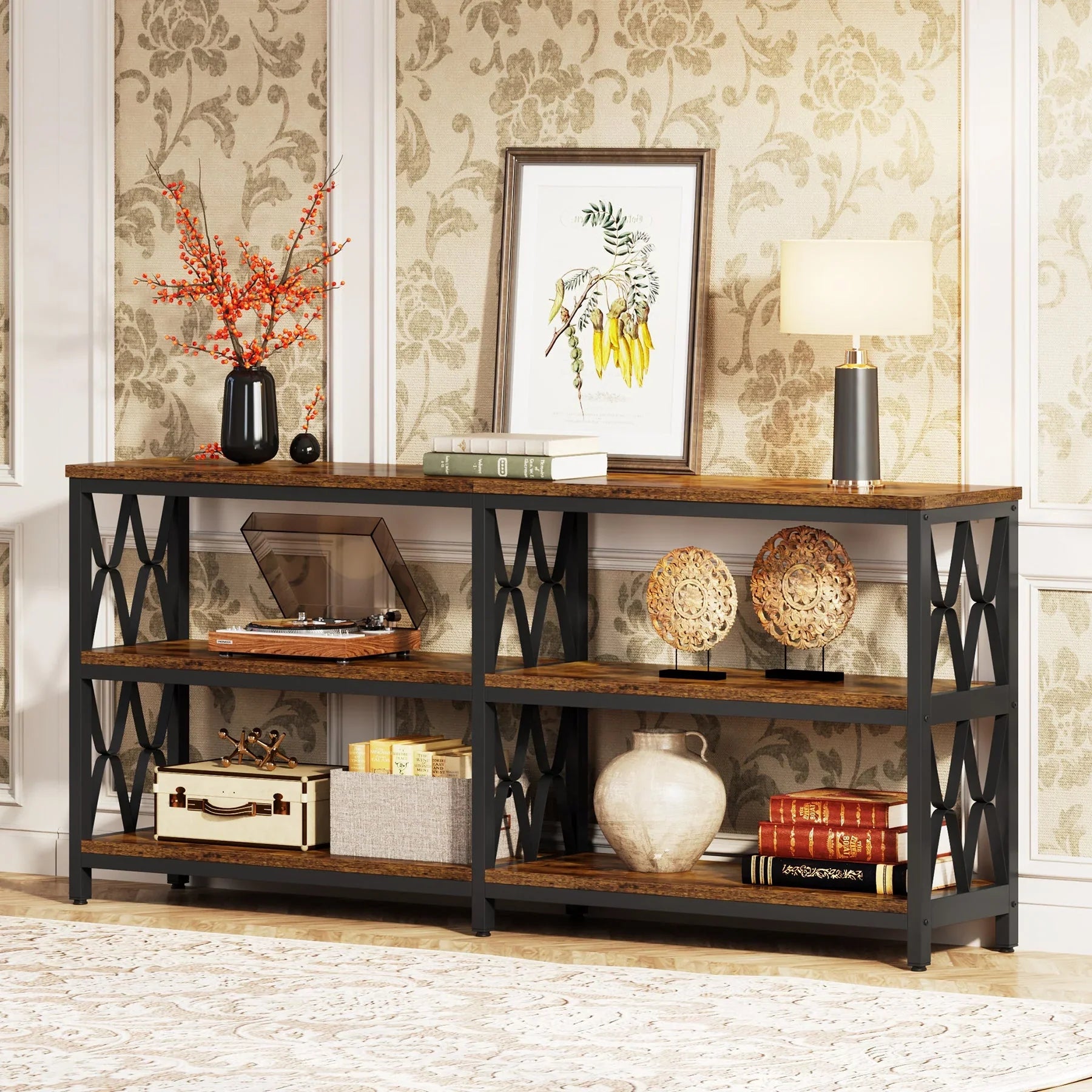 Product Details: This chic console table serves various purposes - perfect as an entryway piece, a sofa table, a bookshelf, or a buffet.  Extra support from angle brackets, flat brackets, and anti-skid pads ensures robustness. Product Dimensions: 11.42"D x 70.87"W x 32.09"H Product Material Type: Premium-Quality Powder Coated Metal Build...