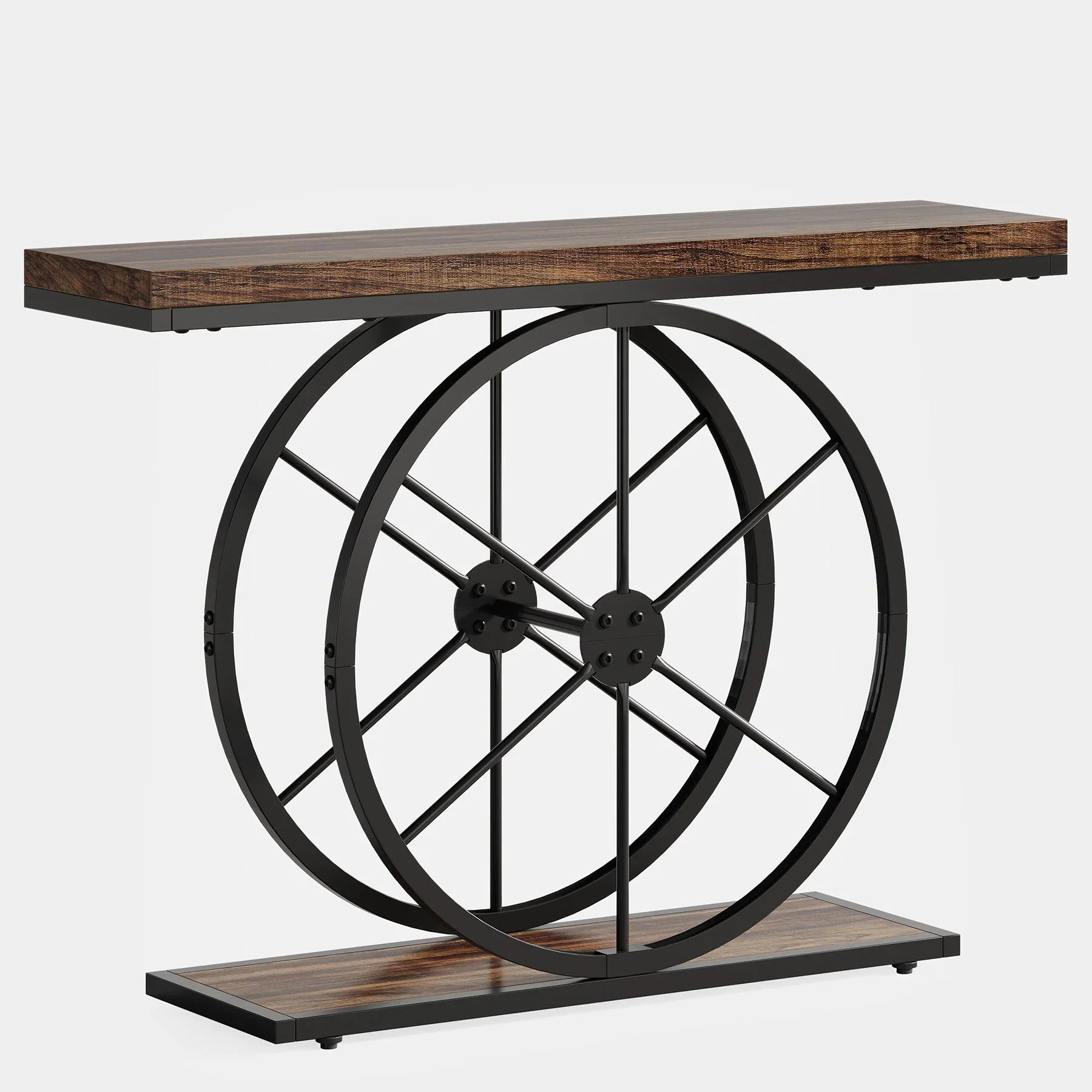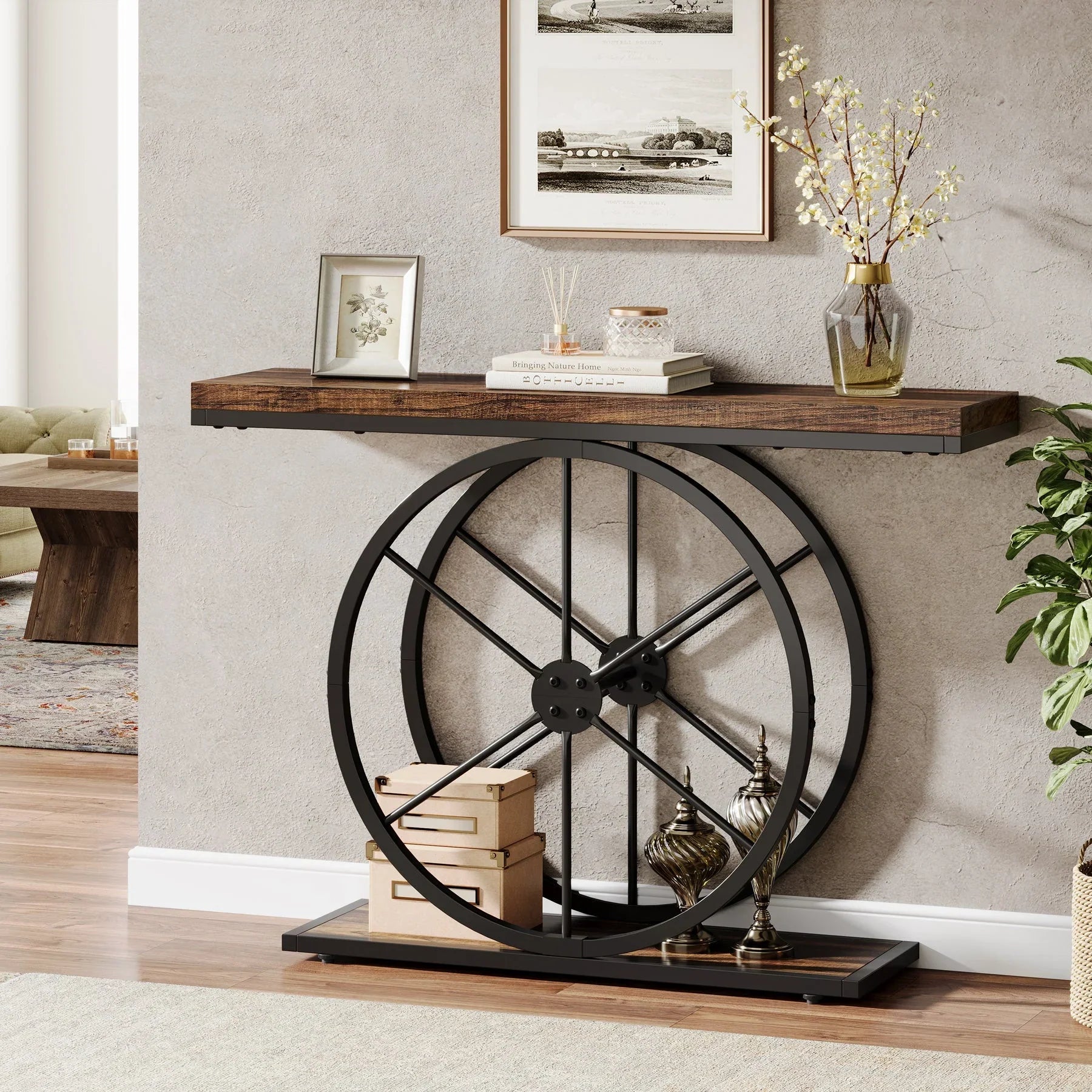 - The black metal frame paired with a rustic wood top and base blends industrial edge and cozy warmth. This entryway table is perfect for your foyer, hallway, or living room.