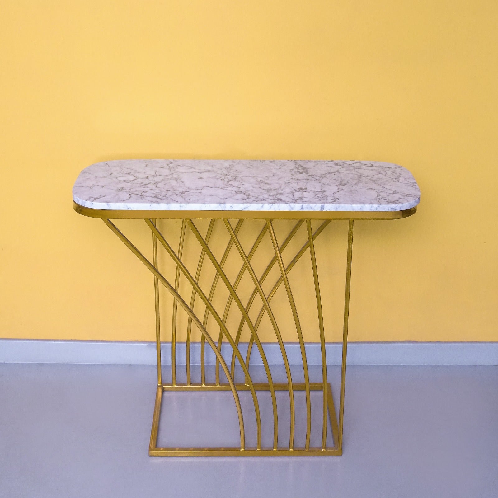 Product Details: Bring a brand new ambiance to your home with this modern narrow console table. The wide marble tabletop in black or white offers a spot for your framed family photos, potted plants, and artful accents. The gold metal base with a straight line adds elegance and lights luxurious...